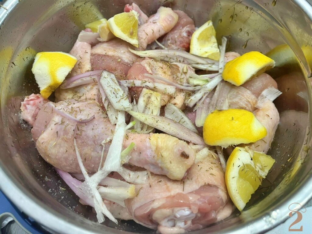 Versate il tutto sul pollo , oliate , salate , pepate , aggiungete del timo tritato ,mescolate bene e fate macerare coperto in frigo per un’ora.
