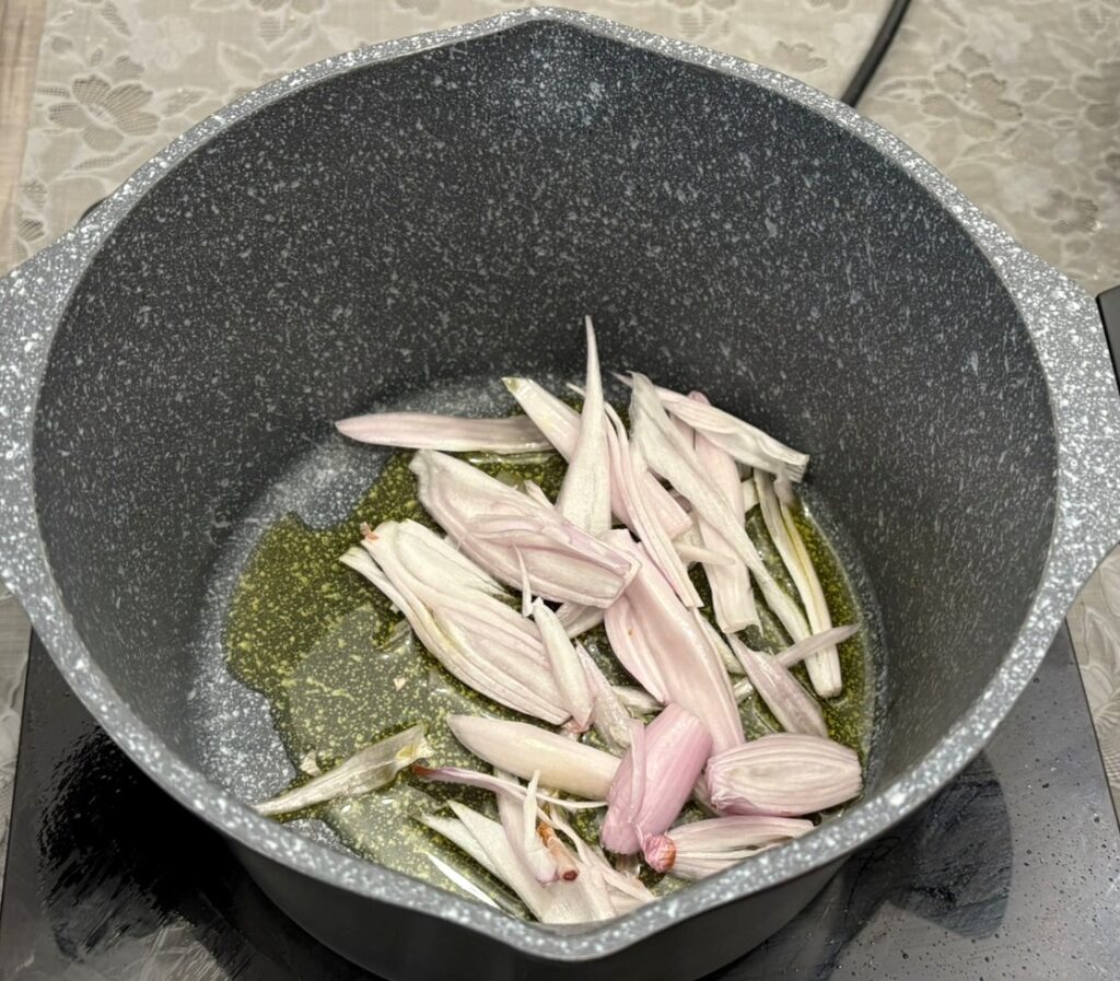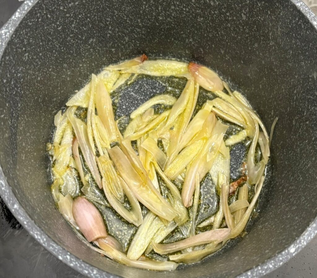 Mentre si freddano scaldate l’olio in una pentola capiente, aggiungetevi lo scalogno affettato e lasciatelo colorare a fiamma bassa.