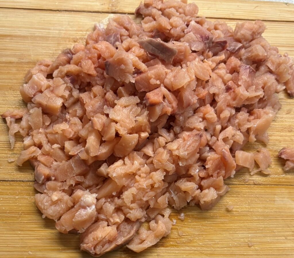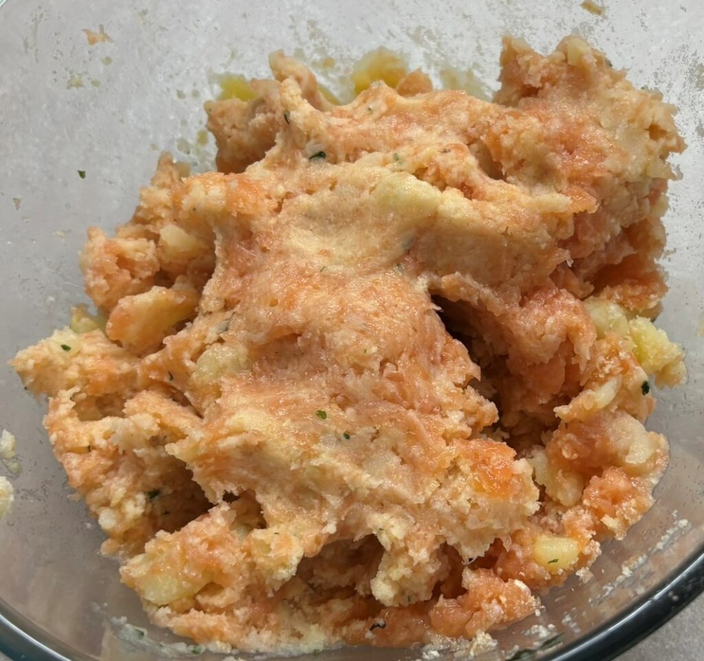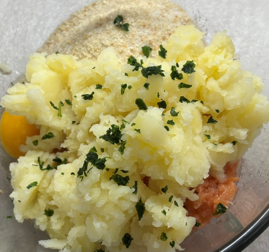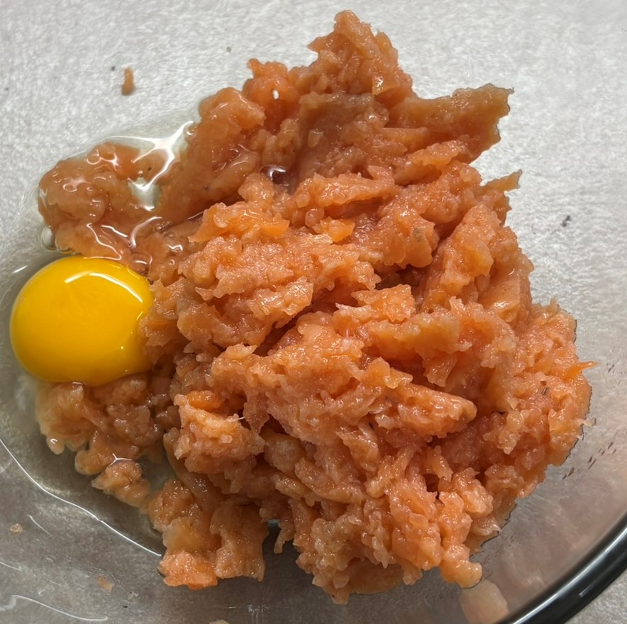 Nel frattempo In una ciotola unite il salmone tritato, l’uovo , il sale, il pangrattato e le patate schiacciate.
