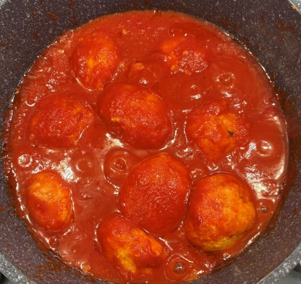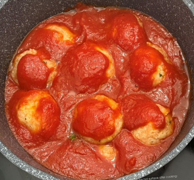 Aggiungete le polpette di salmone al sugo di pomodoro e fate cuocere per 15-20 minuti, a seconda della grandezza .