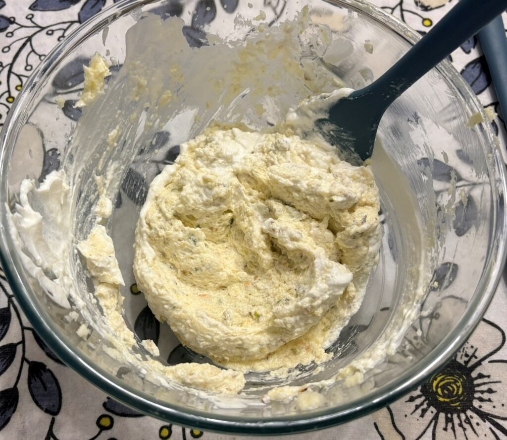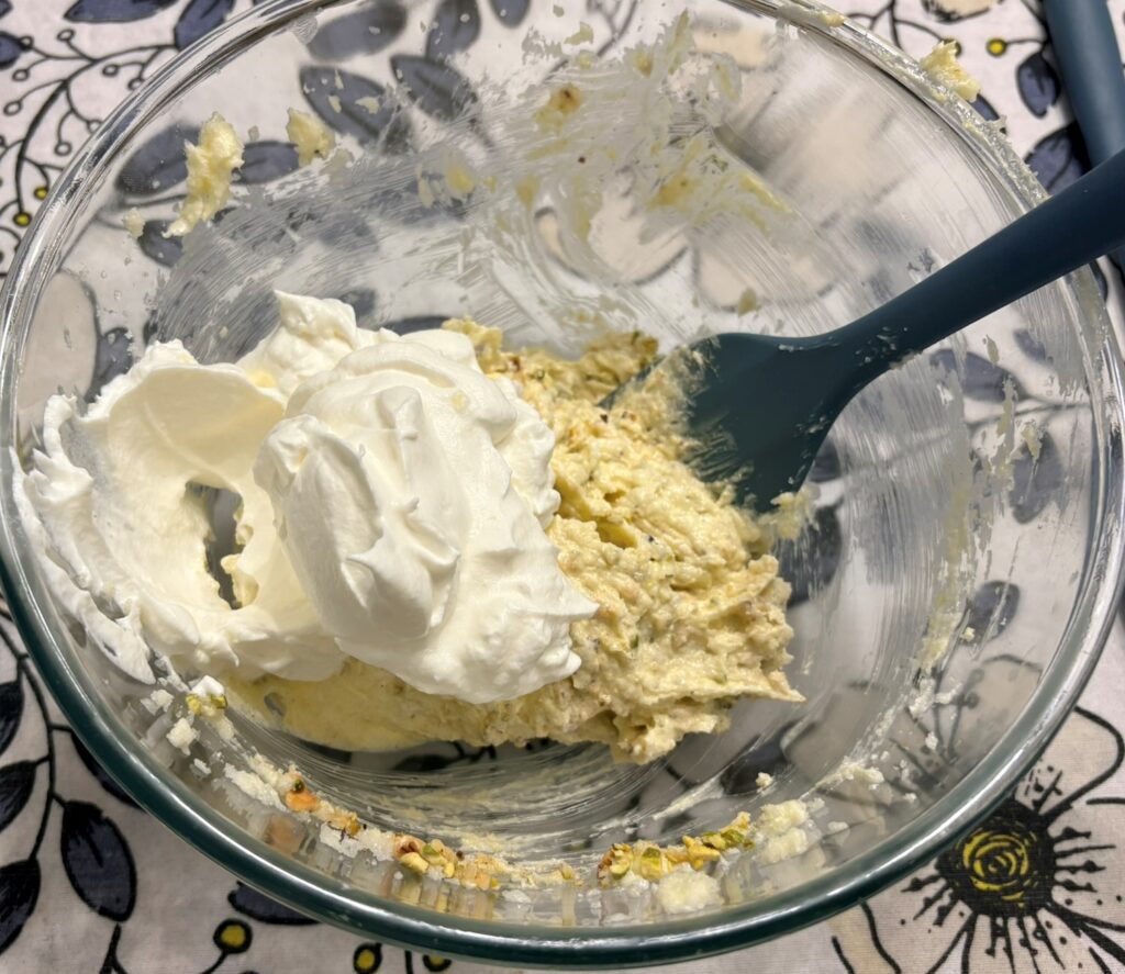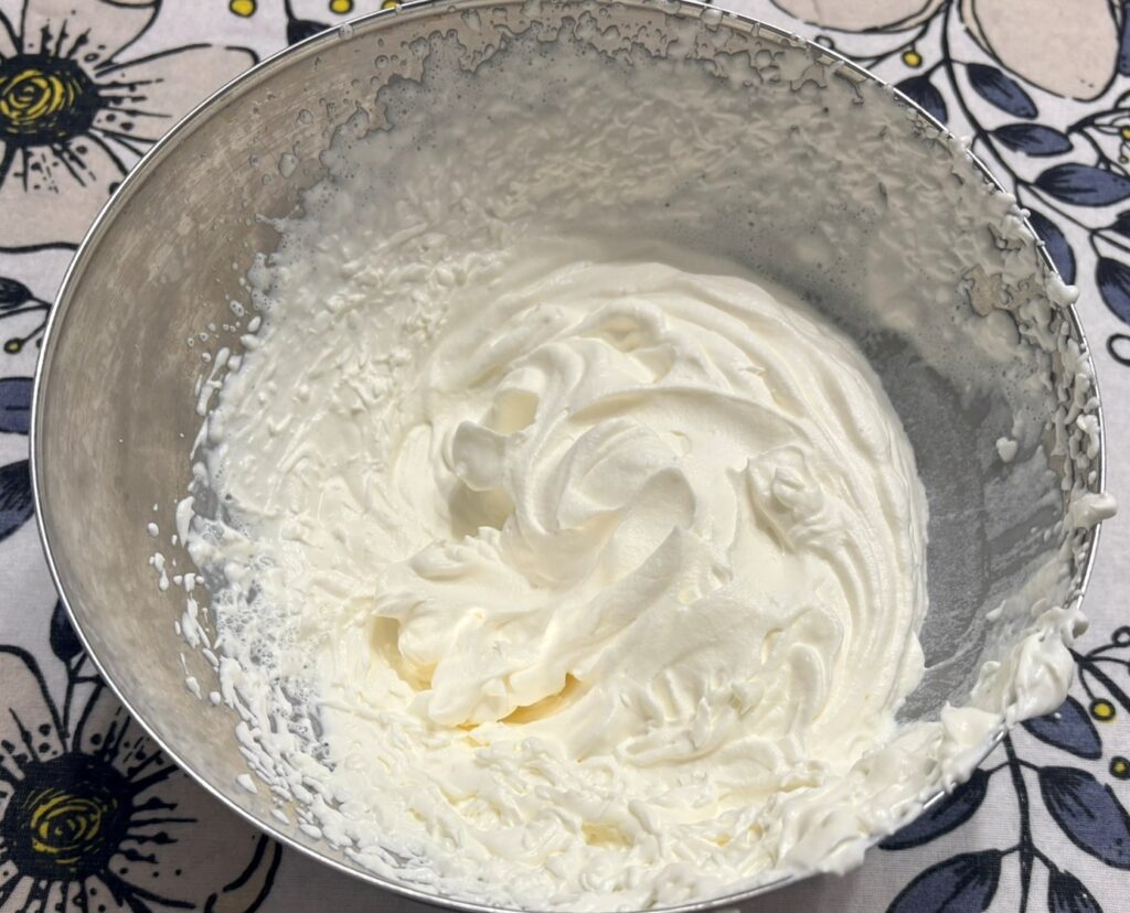 Montate la panna con 2 cucchiai di zucchero e aggiungetene delicatamente 3 cucchiai al tutto.