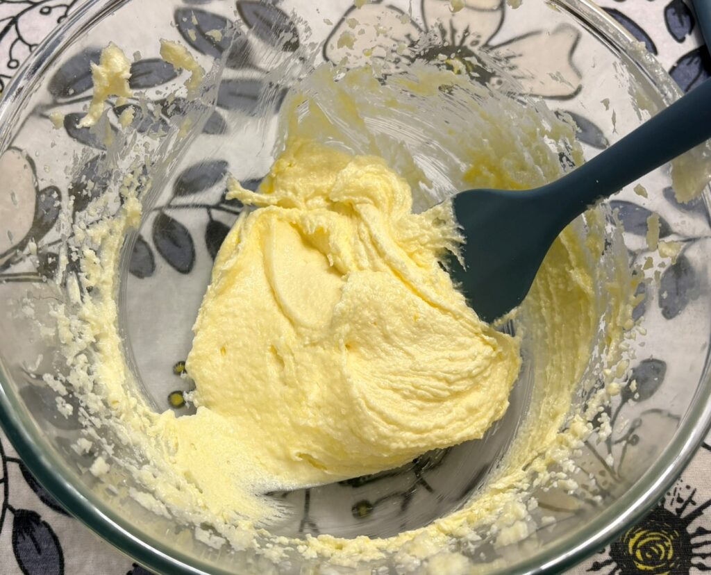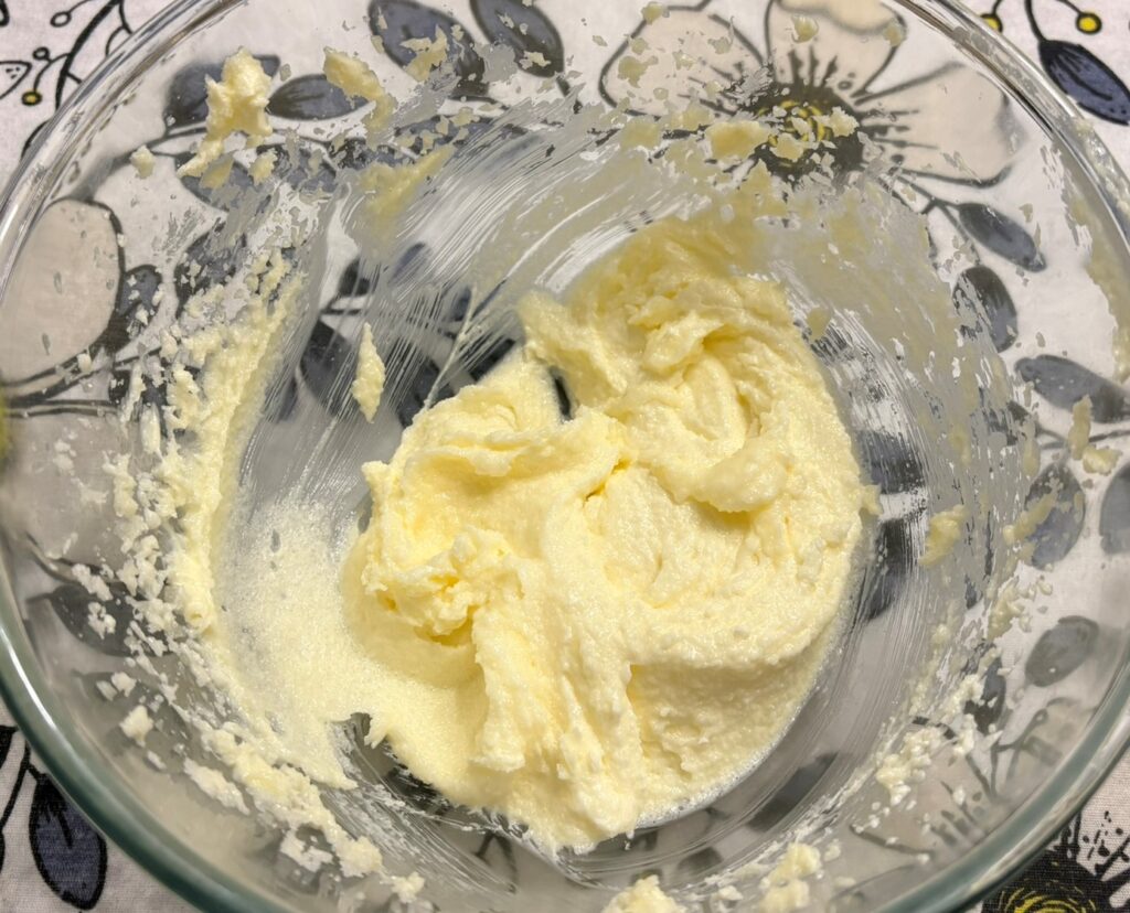 Mettete il burro morbido a pezzettini in una ciotola e montatelo con lo zucchero a velo a bassa velocita per 5 minuti.