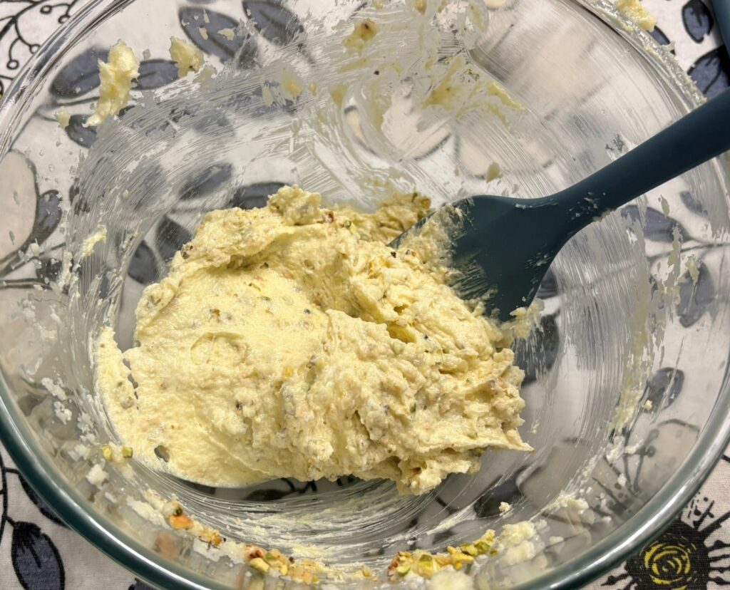 Unite il tuorlo e dopo averlo inglobato al burro unite le nocciole e i pistacchi tritati.