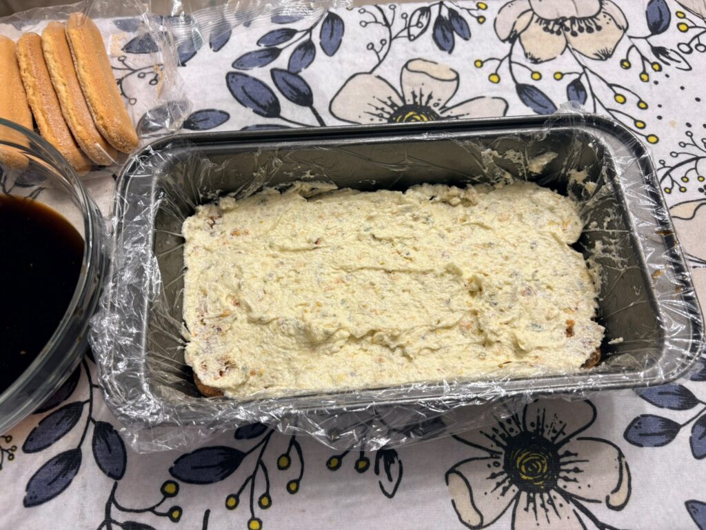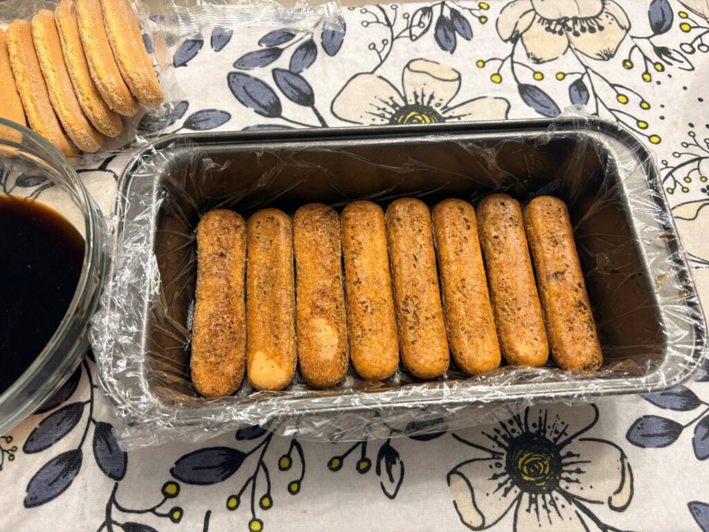 Foderate con pellicola uno stampo da plumcake, inzuppate velocemente i savoiardi e disponeteli sulla base dello stampo.