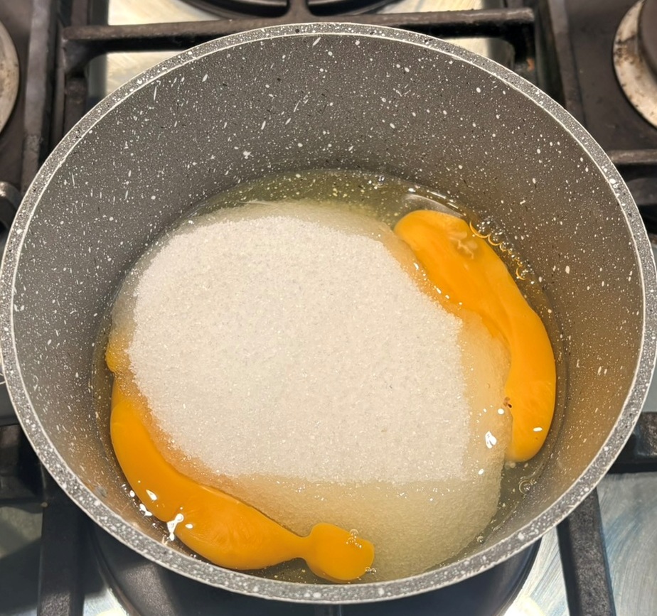 In un pentolino, unite lo zucchero, le uova e sbattete velocemente