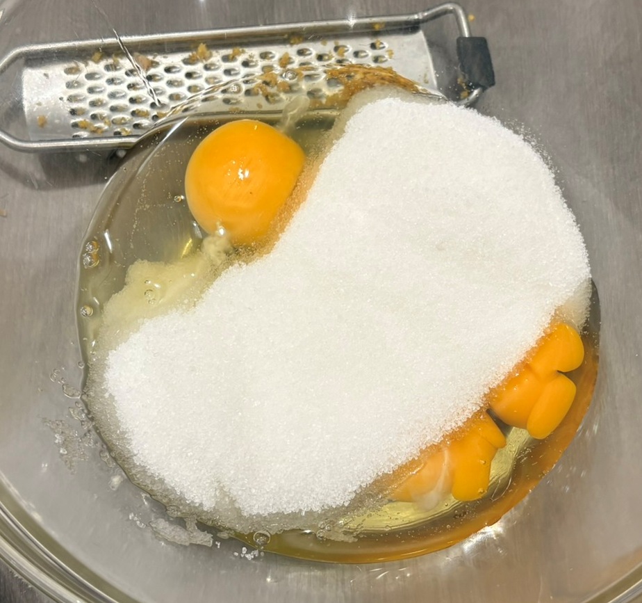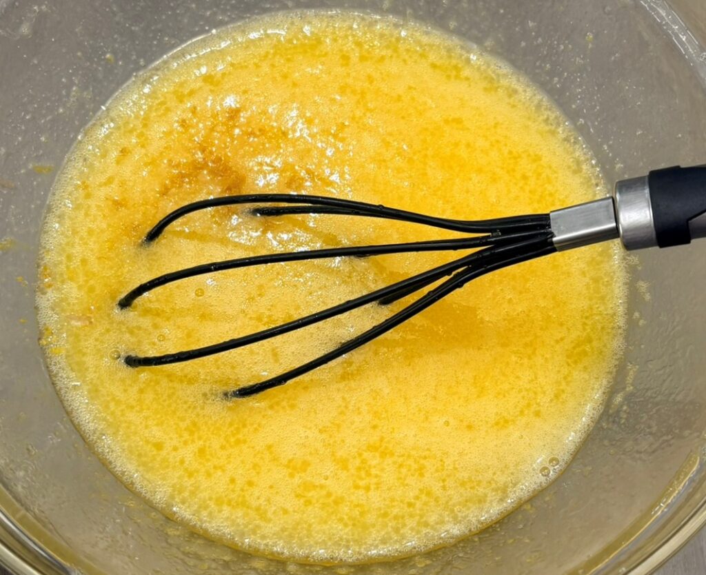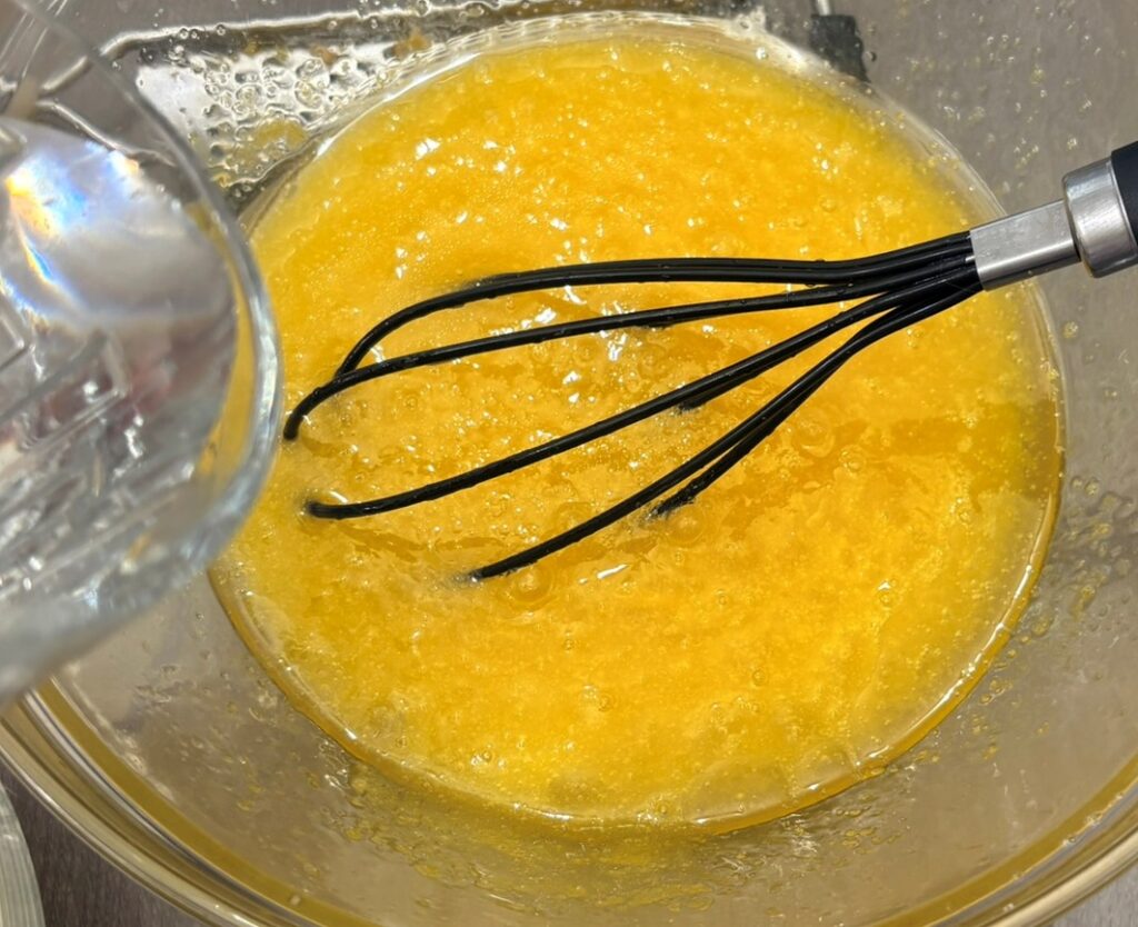 In una ciotola lavorate le uova con lo zucchero e versate a filo prima l’olio e poi l’acqua.