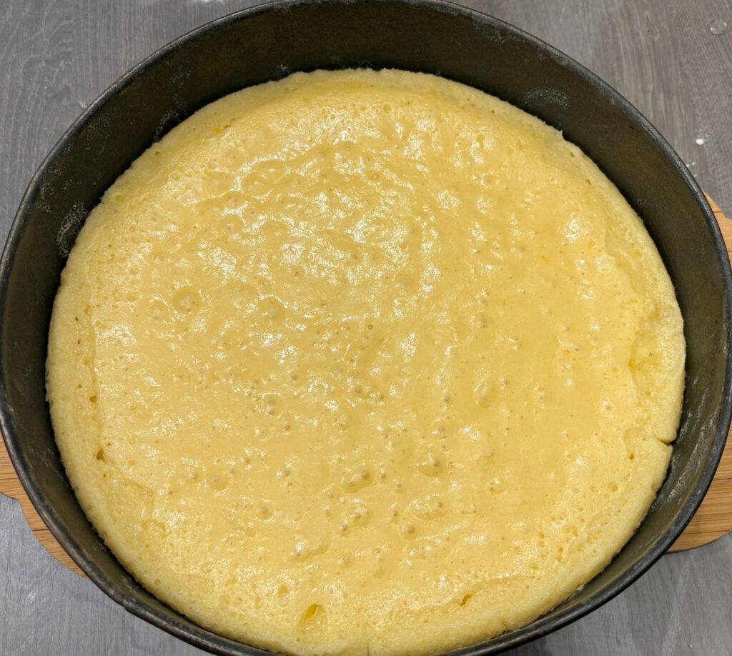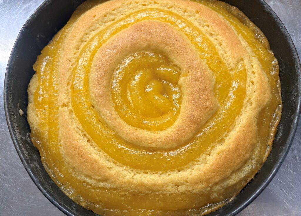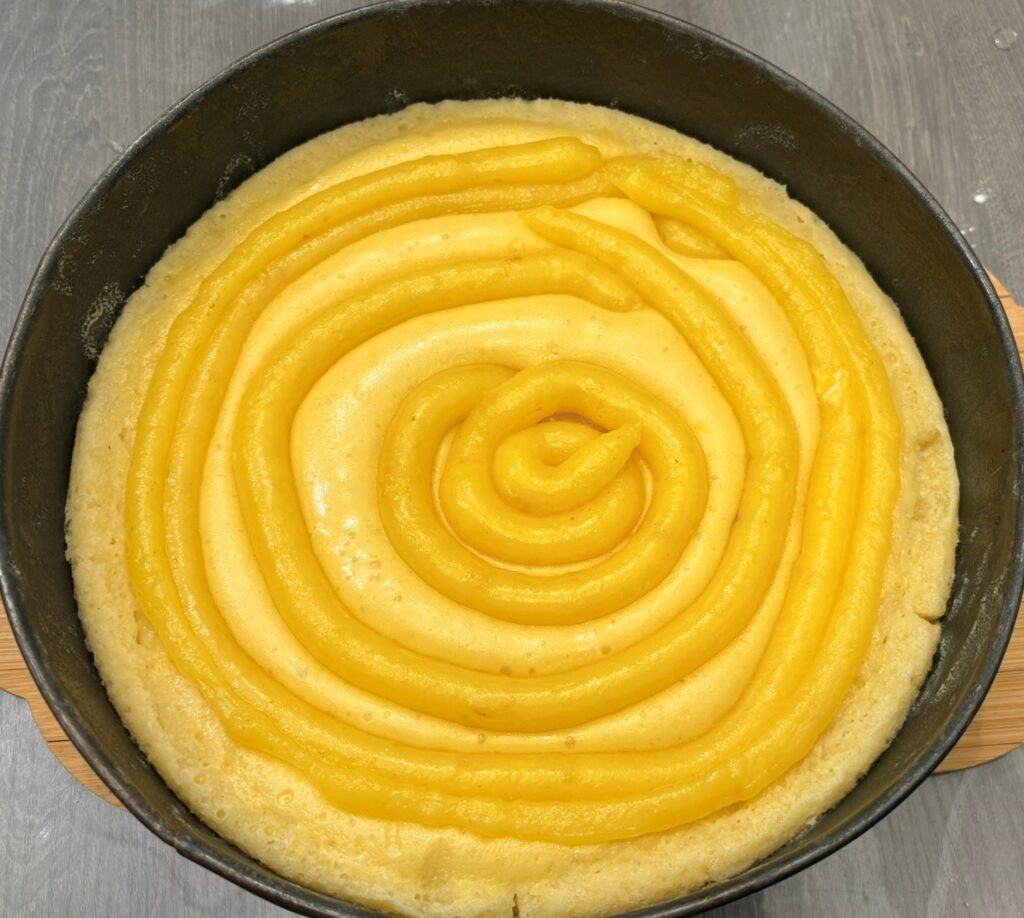 Trascorsi dieci minuti, tirate fuori la torta dal forno, mettete la crema in una sac a poche e partendo dal centro, disegnate una spirale.