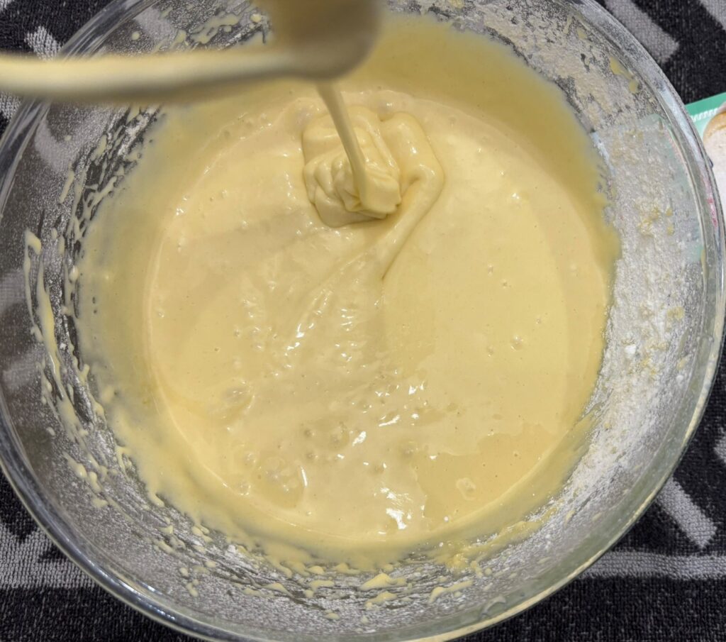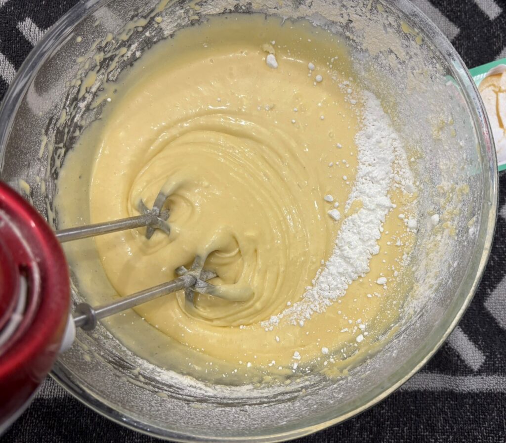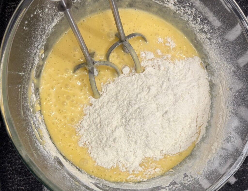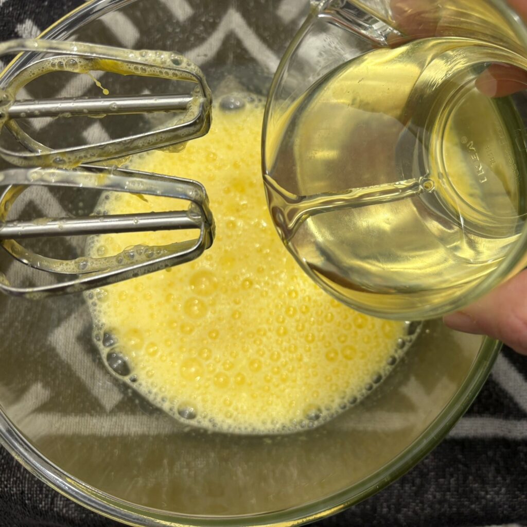 Unite l’olio, la farina setacciata e il lievito.