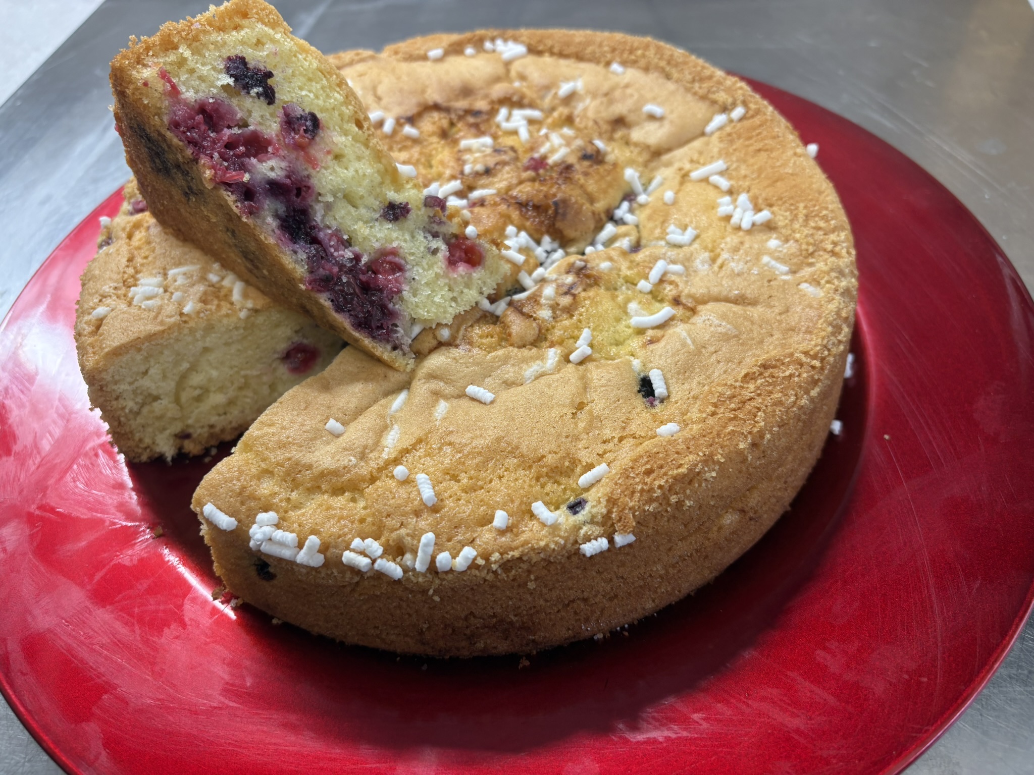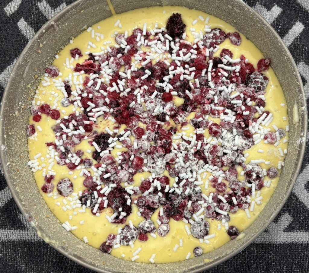 Cospargete la superficie con i frutti di bosco infarinati e sopra della granella di zucchero.