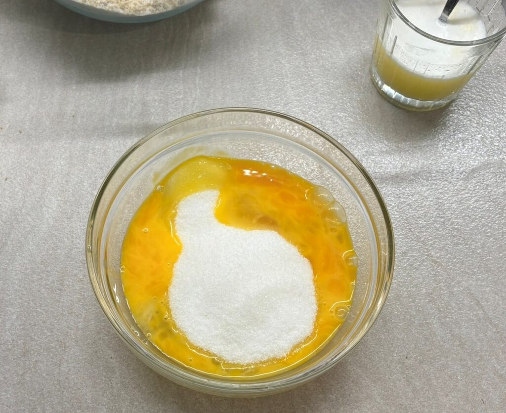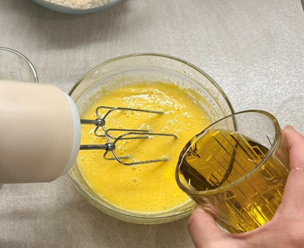 Montate le uova con lo zucchero, versate a filo l’olio e il burro sciolto.