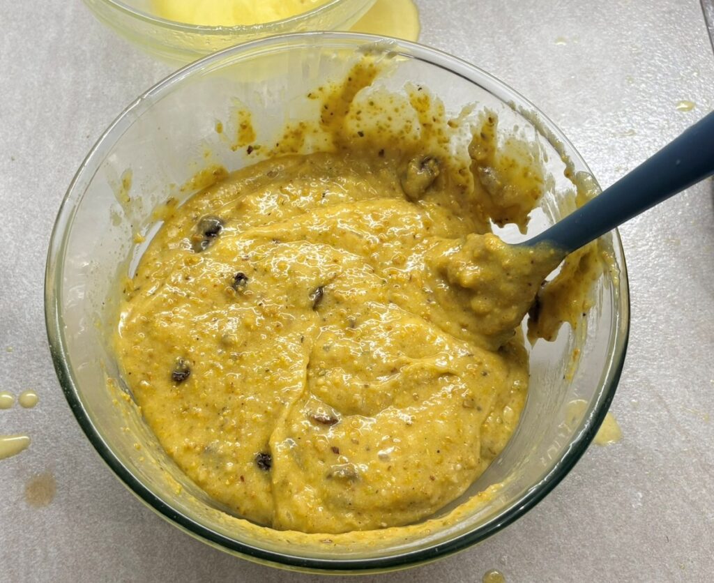 Aggiungete il mix di farina e l’uvetta ammollata con il marsala e mescolate bene.